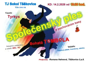 Ples TJ Sokol Těškovice se uskuteční 14.2.2026 od 19:30 v kulturním domě v Těškovicích. Vstupné s místenkou a večeří je 400,- Kč. K tanci hraje kapela Tyrkys. Předprodej vstupenek u paní Romany Hahnové, Těškovice 8.