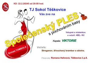 TJ Sokol Těškovice vás zve na společenský ples s pochováním basy, který se uskuteční 22.2.2025 v Kulturním domě v Těškovicích od 20:00. K poslechu a tanci hraje kapela Viktorie. Vstupné s místenkou a večeří 400 Kč.
