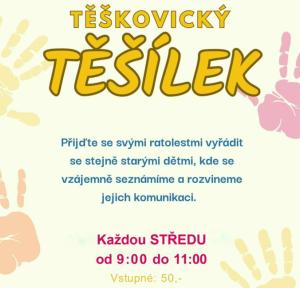 Těškovický Těšílek je klub pro rodiče a děti. Scházíme se každou středu od 9 do 11 hodin v budově multifunkčního sportovního areálu.