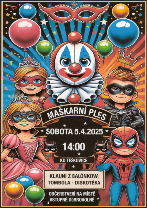 SRPŠ Těškovice vás zve na dětský maškarní ples, který se uskuteční v sobotu 5.4.2025 v kulturním domě v Těškovicích od 14:00. Vstupné je dobrovolné, občerstvení je zajištěno. Srdečně zvou pořadatelé.