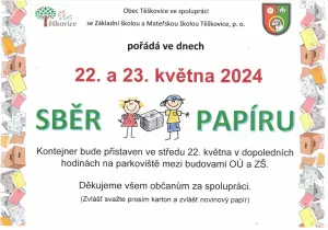 Obec Těškovice ve spolupráci se ZŠ a MŠ Těškovice pořádá ve dnech 22. a 23.5.2024 sběr papíru. Kontejner bude přistaven ve středu 22.5. v dopoledních hodinách na parkoviště mezhi budovami OU a ZŠ. Svažte prosím zvlášť karton a zvlášť novinový papír. Děkujeme za spolupráci.