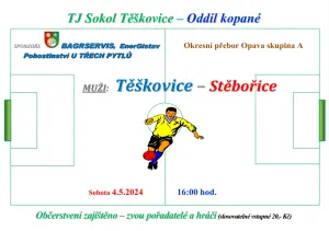 Oddíl kopané TJ Sokol Těškovice Vás zve na zápas Těškovice - Stěbořice, který se odehraje v sobotu 4.5.2024 od 16:00 hodin v multifunkčním sportovním areálu Těškovice.