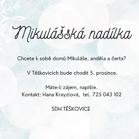 SDH Těškovice nabízí rodičům možnost Mikulášské nadílky, 5.12.2024. Zájemci o návštěvu Mikuláše, Čerta a Anděla u vás doma pište Haně Krayzlové, tel. 725 043 102.