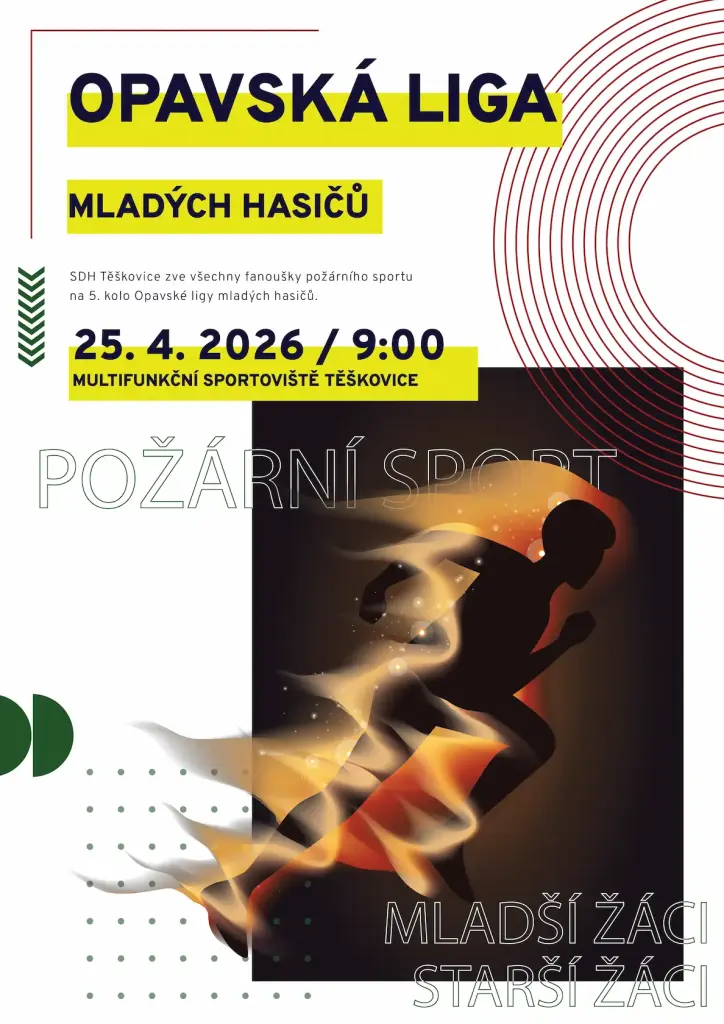 Sbor dobrovolných hasičů Těškovice srdečně zve všechny občany i fanoušky požárního sportu na 5. kolo Opavské ligy mladých hasičů, které se uskuteční v sobotu 25. dubna 2026 od 9:00 hodin na Multifunkčním sportovišti v Těškovicích.