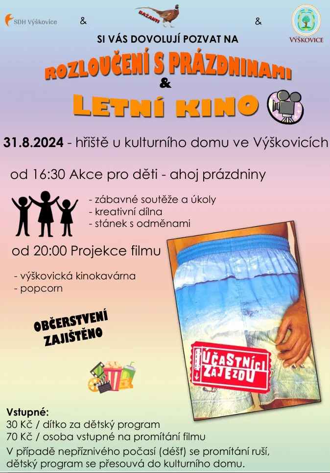 SDH Výškovice, spolek Bažanti a obec Výškovice vás zvou na Rozloučení s prázdninami a Letní kino, které se uskuteční 31.8.2024 na hřišti u KD ve Výškovicích. OD 16:30 je akce pro Děti "Ahoj prázdniny" od 20:00 pak projekce filmu "Účastníci zájezdu".