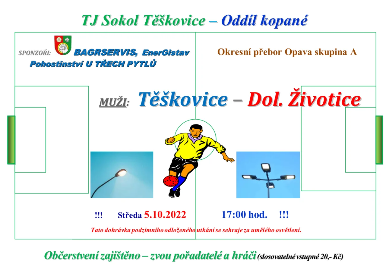 Oddíl kopané TJ Sokol Těškovice vás zve na fotbalové utkání Těškovice - Dolní Životice, které se uskuteční ve středu 5.10. v místním multifunkčním sportovním areálu. Začátek utkání je v 17:00. Tato dohrávka odloženého utkání se sehraje za umělého osvětlení.