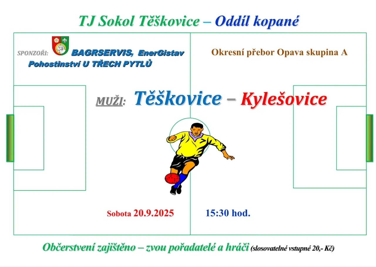 Oddíl kopané TJ Sokol Těškovice Vás zve na zápas Těškovice - Kylešovice, který se odehraje v sobotu 20.9.2025 od 15:30 hodin v multifunkčním sportovním areálu Těškovice.