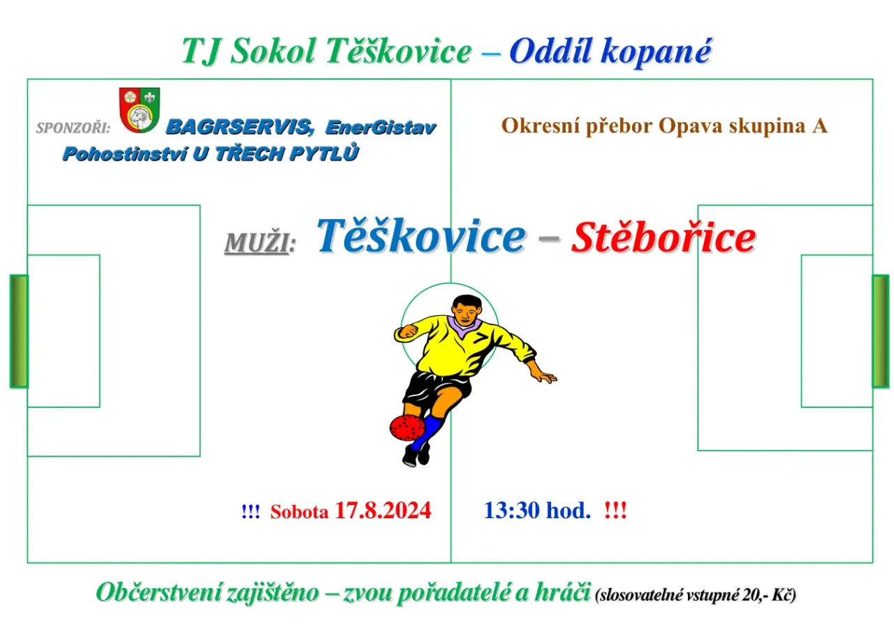 Oddíl kopané TJ Sokol Těškovice Vás zve na zápas Těškovice - Stěbořice, který se odehraje v sobotu 17.8.2024 od 13:30! hodin v multifunkčním sportovním areálu Těškovice.