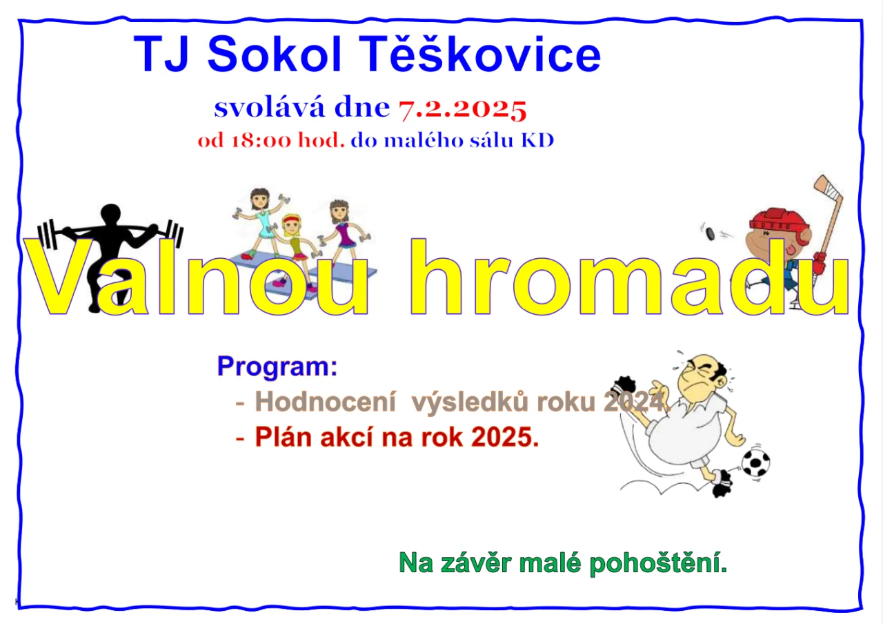 TJ Sokol Těškovice svolává na 7.2.2025 od 18:00 do malého sálu kulturního domu v Těškovicích valnou hromadu.