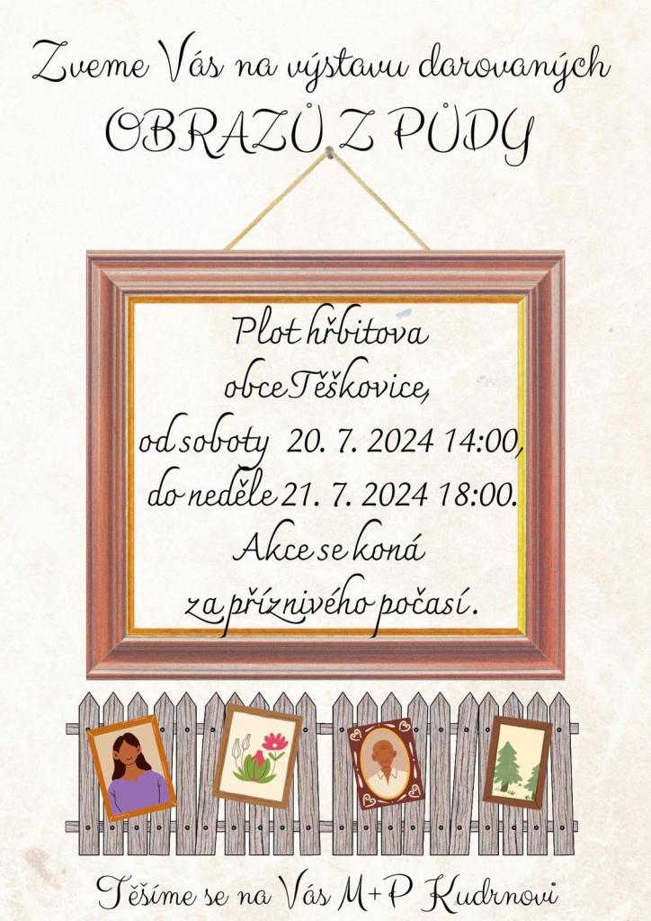 Zveme Vás na výstavu darovaných obrazů z půdy. Ty najdete od soboty 20.7.2024 14:00 do neděle 21.7.2024 18:00 na plotu Těškovického hřbitova. Akce se koná jen za příznivého počasí. Těšíme se na vás.