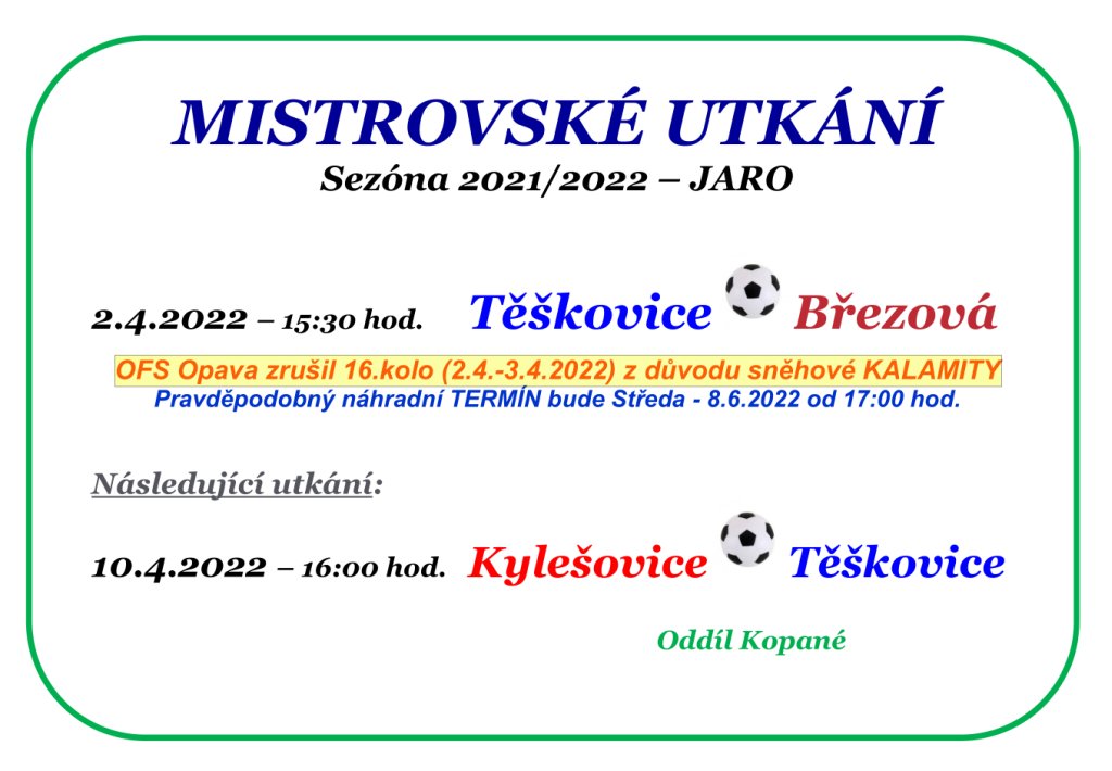 OFS Opava zrušil 16.kolo (2.4.-3.4.2022) z důvodu sněhové kalamity.