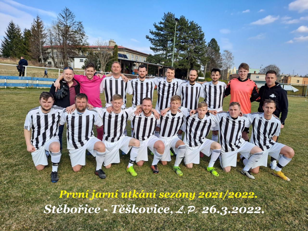 K prvnímu jarnímu tkání jsme zajížděli na „horkou“ půdu do Stěbořic. Úvod zápasu nám vyšel znamenitě a v 5´ po chybné rozehrávce domácích vysune Vojta Vavrečka zabíhajícího Matěje Krayzla a vedeme 0:1. V 15´ přetažený centr Ondry Strojila z levé strany hřiště vrací do šestnáctky Petr Kupka a Vilém Krayzel pohotově na 2x zvyšuje na 0:2. Domácí se v této fázi utkání zmohli jen na dlouhé pasy a nakopávané míče, se kterými si Roman spolu s obranou poradili. Ve 30´ je v malém vápně zasažen evidentně kopačkou domácích do hlavy Vilém Krayzel, ale píšťalka hlavního sudího zůstává němá a PENALTA se nepíská. PENALTA se však píská v závěru poločasu na druhé straně hřiště, když míč směřující do naší sítě reflexivně vyráží rukou Jakub Krayzel nad břevno. Jakub je vyloučen a domácí z nařízené penalty snižují na 1:2.